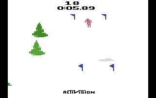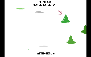Beim Skifahren ist es dein Ziel, so schnell wie möglich ins Tal zu gelangen. Die Piste ist tückisch mit vielen Bäumen und Buckeln! Es gibt zwei verschiedene Spielmodi. Im Slalom musst du mehrere Tore durchfahren; verpasst du ein Tor, erhältst du eine Zeitstrafe. Im Abfahrtsmodus musst du einfach nur so schnell wie möglich ins Tal fahren. Jeder Modus bietet fünf verschiedene Schwierigkeitsgrade, die die Streckenlänge (und die Anzahl der Tore im Slalom) beeinflussen.